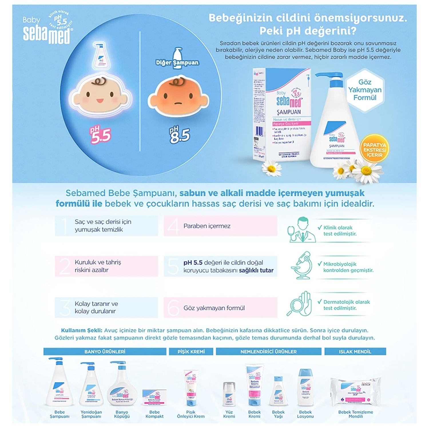 Sebamed Bebek Şampuanı 750 ml pompalı, hassas bebek cildi ve saç derisi için özel geliştirilmiş sabun ve alkali içermeyen formüle sahiptir. Göz yakmayan ve dermatolojik olarak test edilmiş yapısıyla bebeklerin saçlarını nazikçe temizler. Pratik pompalı şişesi ile kolay kullanım ve ekonomik fırsat paketi sunar.