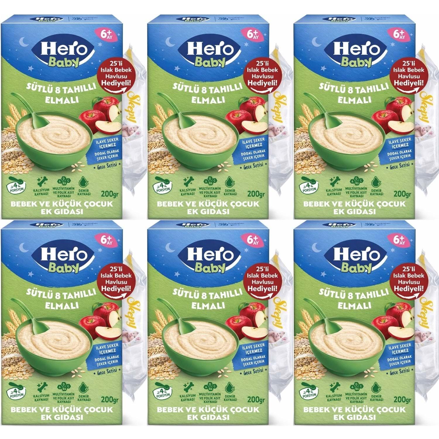 Hero Baby Kaşık Maması 200GR Gece Sütlü Elmalı 8 Tahıllı + Islak Mendil Hediye (6 Lı Set)