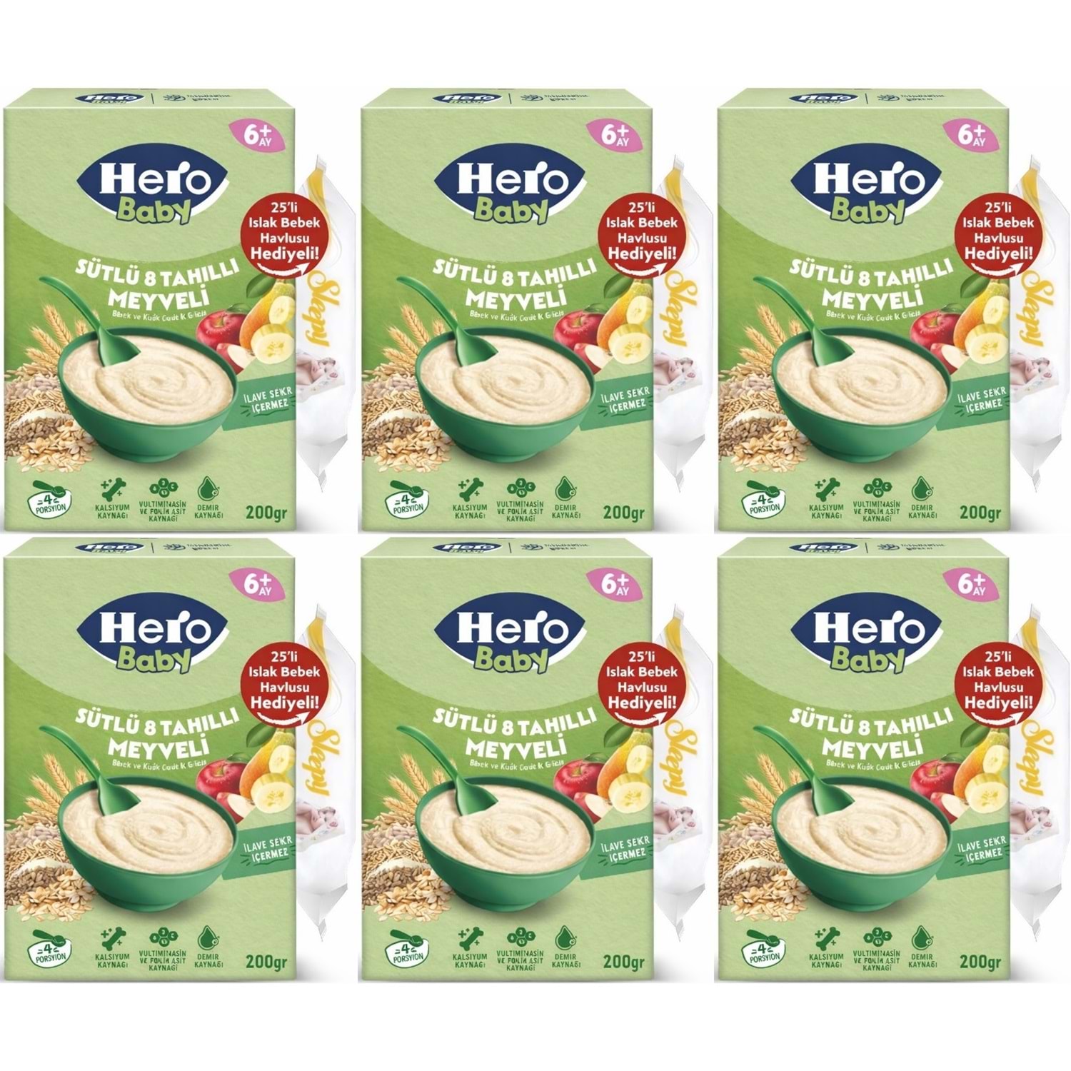 Hero Baby Kaşık Maması 200GR Sütlü 8 Tahıllı Meyveli + Islak Mendil Hediye (6 Lı Set)