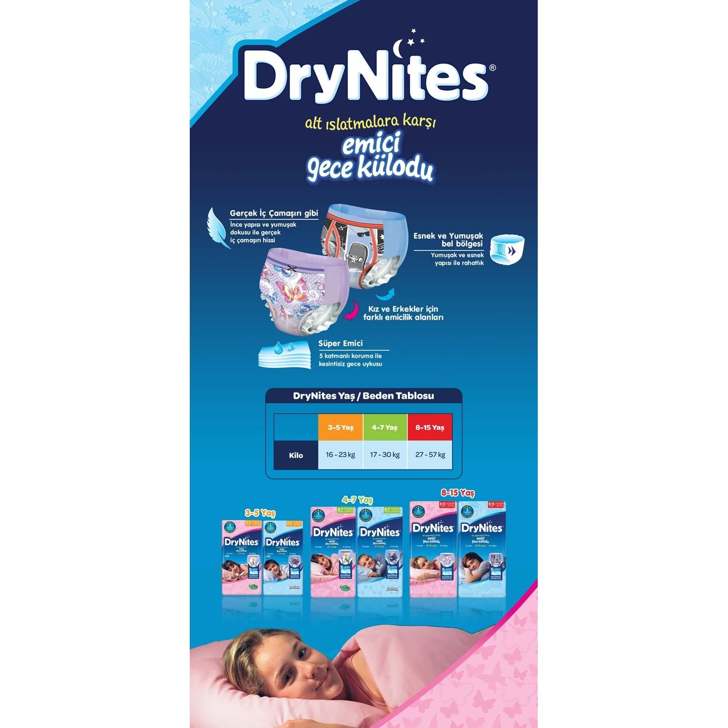 Gece alt ıslatmaları için özel olarak tasarlanmış Drynites Emici Gece Külotları, 4-7 yaş arası erkek çocukların gece boyunca kuru ve güvende hissetmesini sağlar. İç çamaşırına benzeyen ince ve esnek yapısıyla çocuğunuzun konforunu bozmadan hareket özgürlüğü sunar.