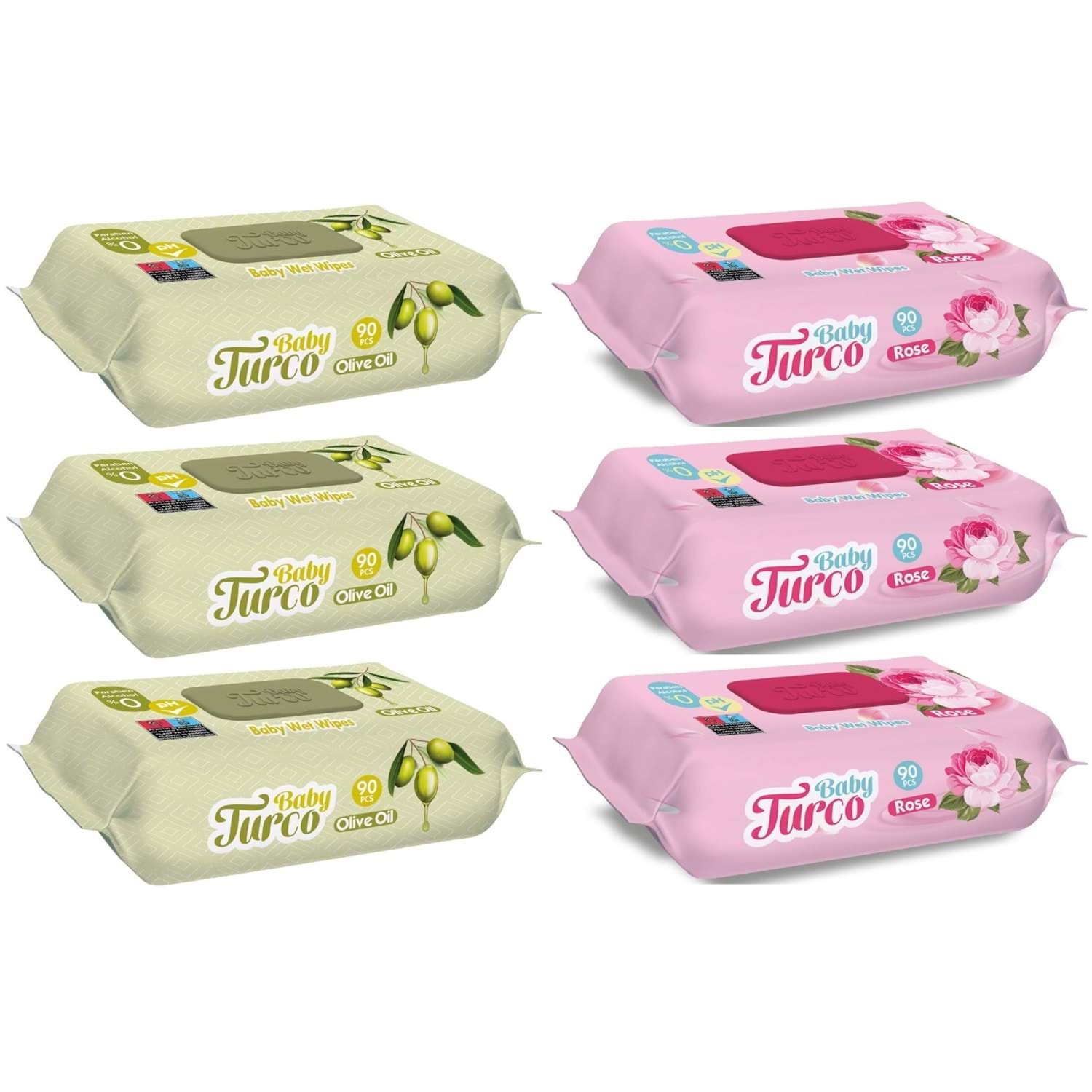 Baby Turco Islak Havlu Mendil 90 Yaprak Karma 6 Lı Set (Gül/Zeytinyağı) 540 Yaprak Plastik Kapaklı