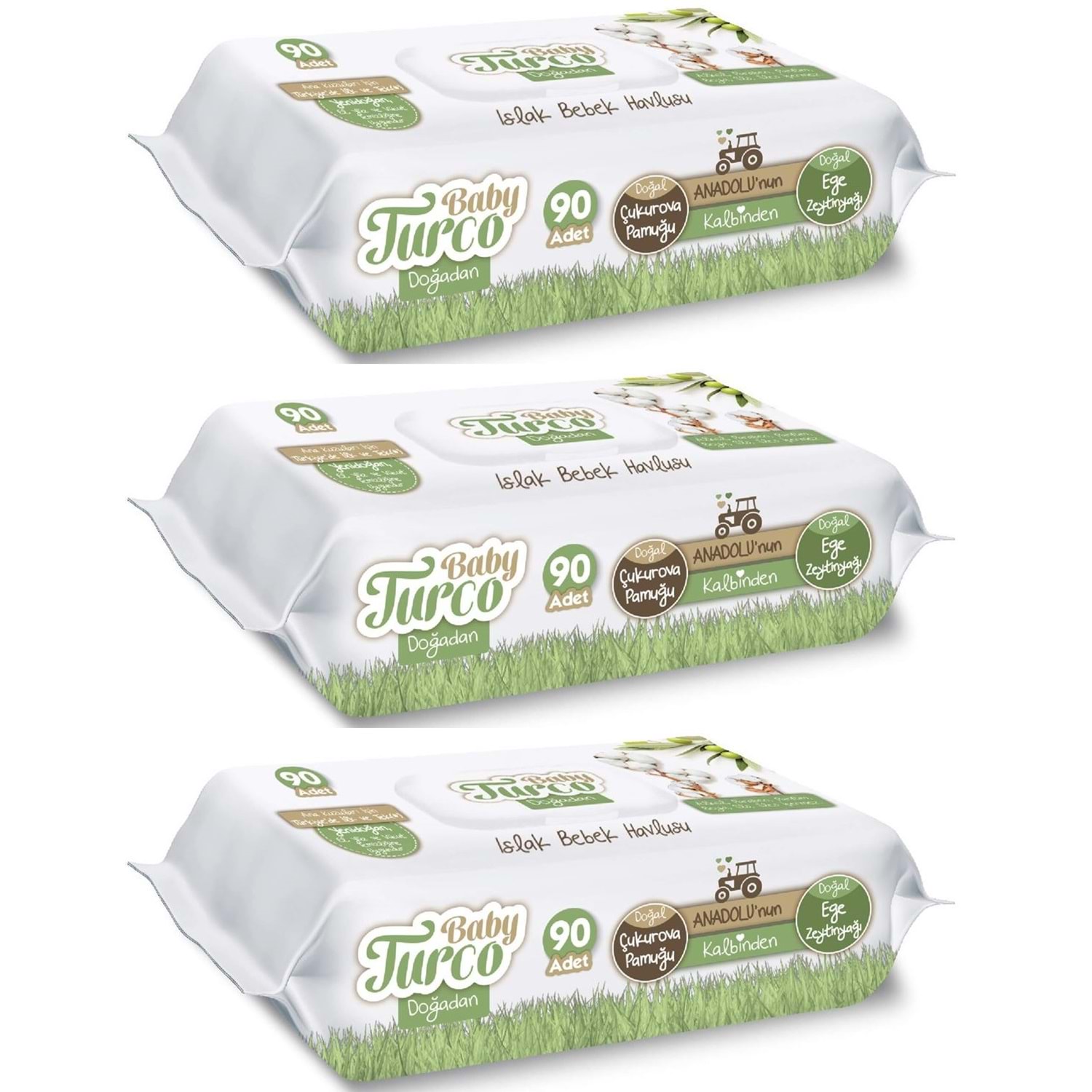 Baby Turco Islak Havlu Mendil Yenidoğan 90 Yaprak Doğadan 3 Lü Set 270 Yaprak Plastik Kapaklı