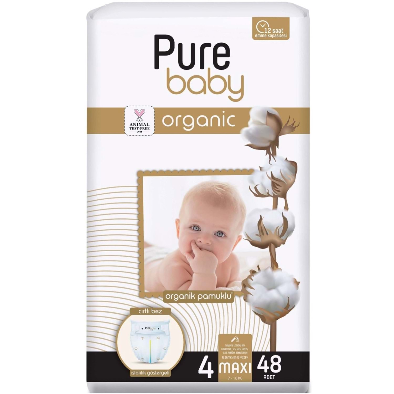 Pure Baby Organik Bebek Bezi 4 Beden 7-16 KG Maxi 144 Adet Aylık Fırsat Pk (3PK*48)