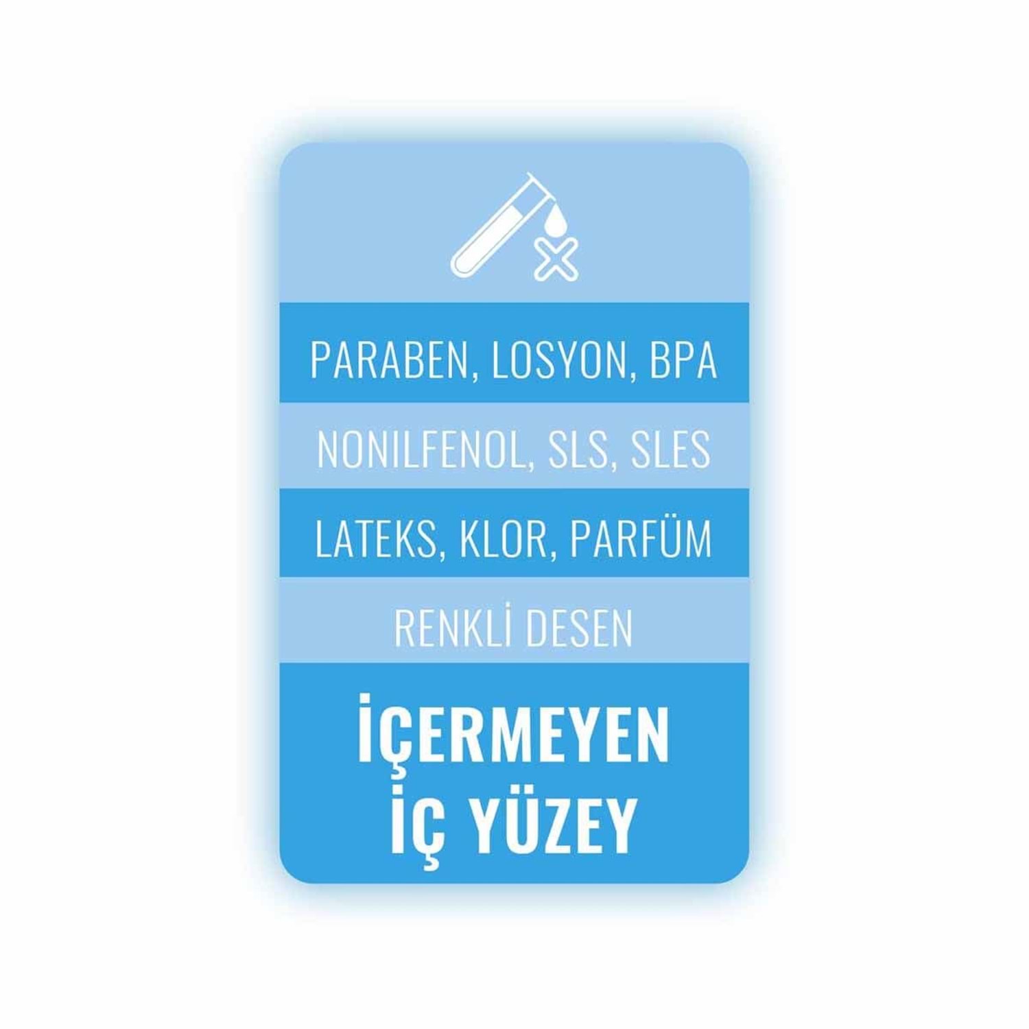 • Paraben, parfüm, losyon ve renklendirici desen içermeyen iç yüzey cildinize daha saf dokunuş sağlar.