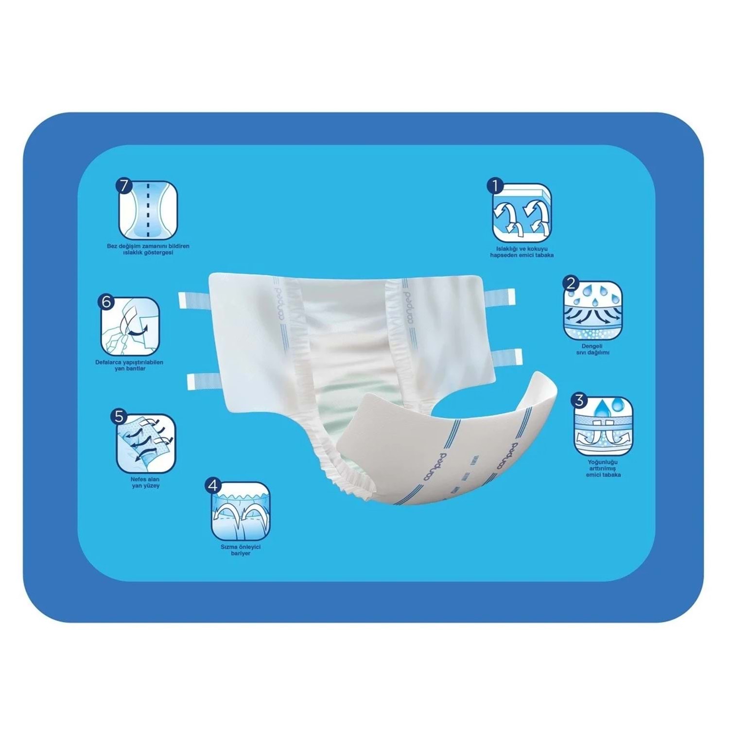 Canped Bel Bantlı Yetişkin Hasta Bezi, gün boyu güvenli koruma ve konfor sağlamak için geliştirilmiştir. Tekstil yüzeyi cilde yumuşaklık kazandırırken, nefes alabilir yapısı sayesinde ferahlık hissi sunar. Ayarlanabilir bel bantları vücuda tam uyum sağlayarak hareket özgürlüğü verir. Yüksek emici tabaka sıvıyı hızla emer, cildi kuru tutar ve sızdırmaz bariyerleri sayesinde güvenli kullanım sağlar.