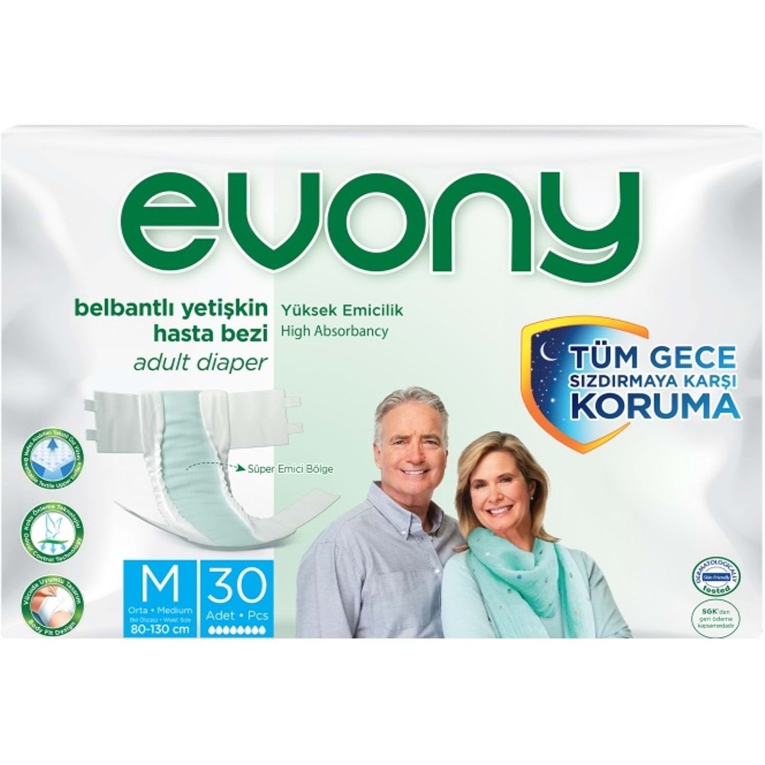 Evony Yetişkin Bel Bantlı Hasta Bezi, orta beden kullanıcılar için tasarlanmış yüksek emicilik sağlayan, cilt dostu tekstil yüzeyli pratik bir üründür. Ayarlanabilir bantları ile vücuda tam uyum sağlar, gün boyu kuru kalmanızı destekler.