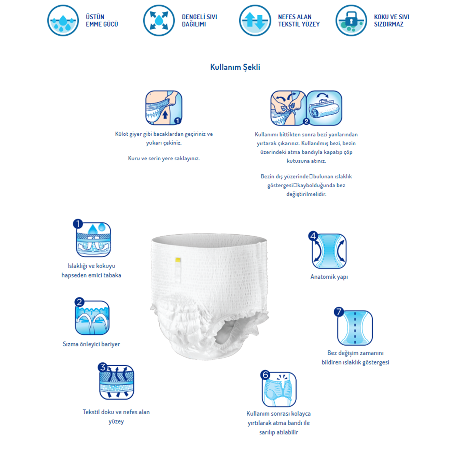 Islaklık ve kokuyu hapseden özel emici tabakası sayesinde kuru ve güvende hissettirir.